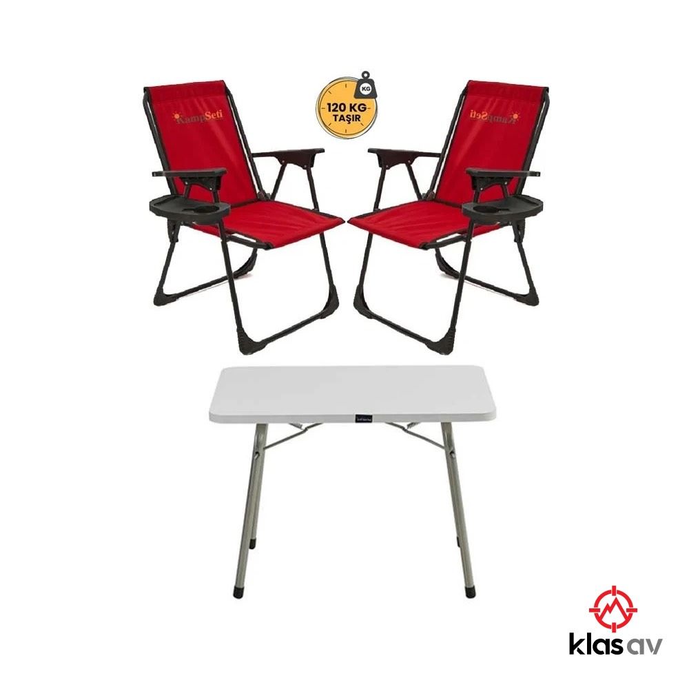 Kampseti 2 Adet Kırmızı Katlanır Kamp Sandalye ve 1 Adet Masa Seti-Taşınabilir Piknik Bahçe Sandalyesi-Masası
